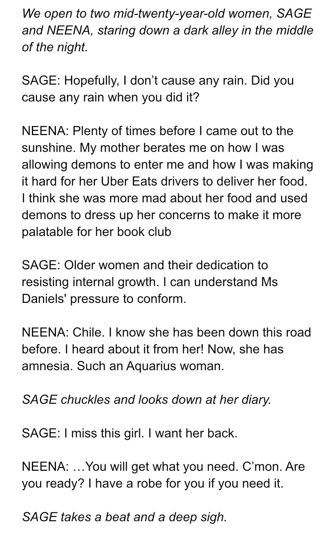 Capitalize the character’s name (e.g., NINA) in the action block. This is simply a convention rule.